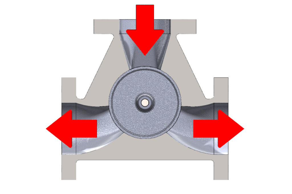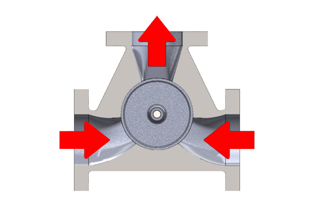Walton valves may be installed to either mix fluids from two inlets and discharge through a single outlet (mixing), or to divide the flow from one inlet into two outlets (diverting).