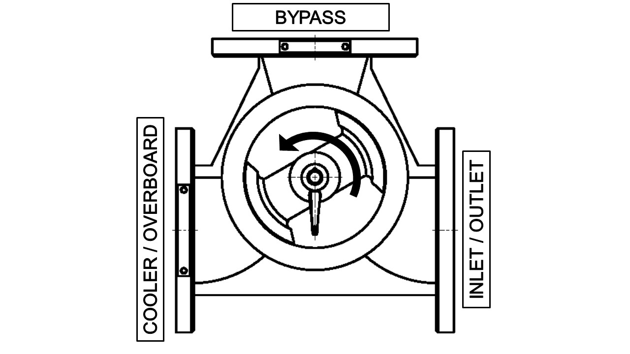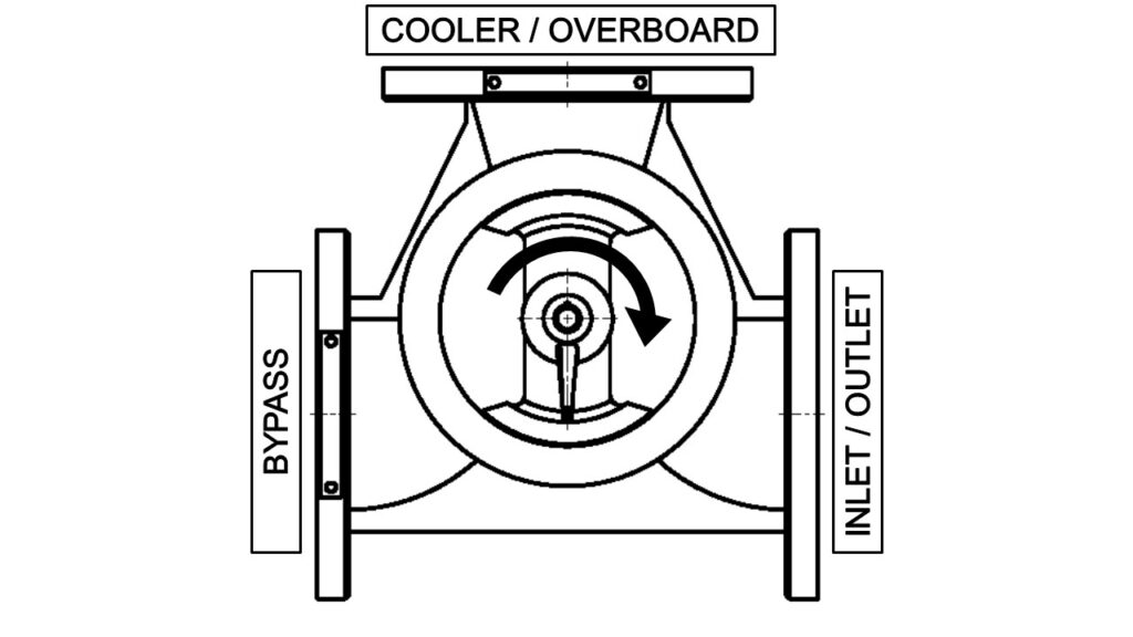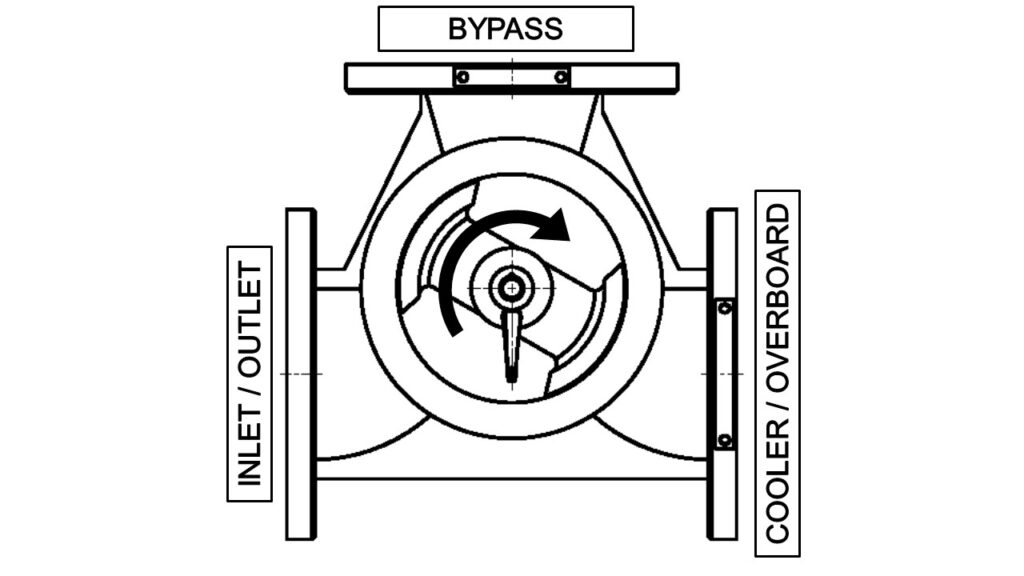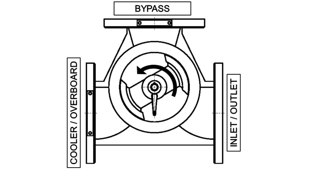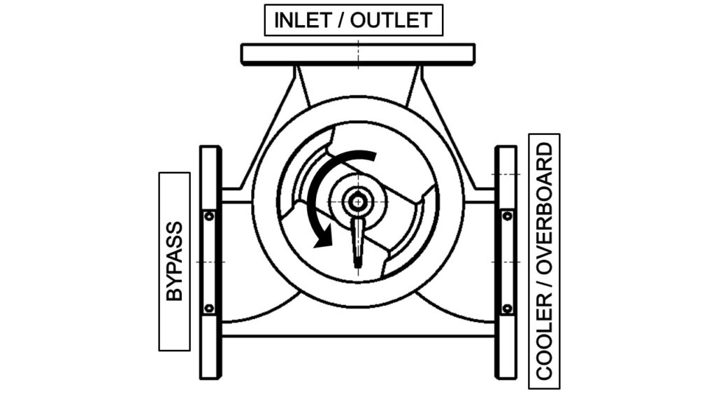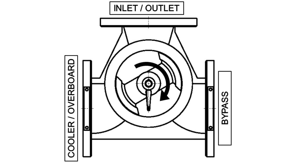 When operating as a diverter, the valve is fitted upstream of the cooler. The inlet from the heat source enters one port and is divided into two outlet streams to the cooler and bypass in proportions determined by the position of the valve's rotor. This maintains the temperature of the fluid returning to the heat source at the required temperature.