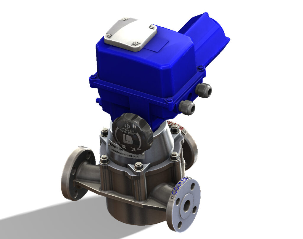 The valve body has three ports leading into flanged branches. Fluid flow through the valve is controlled by a rotor, the end shutters of which travel over two of the ports to direct flow to either the cooler or bypass branches, or to proportion the flow between the two. The rotor is driven by an electric actuator mounted on the valve; this is activated by a signal from the Walton electronic controller.