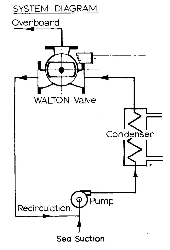 The piping is arranged so that the valve can either discharge water overboard, or re-circulate water to the pump suction or proportion the incoming flow of water to both the overboard and re-circulation branches in accordance with the gas pressure in the refrigerant condenser.